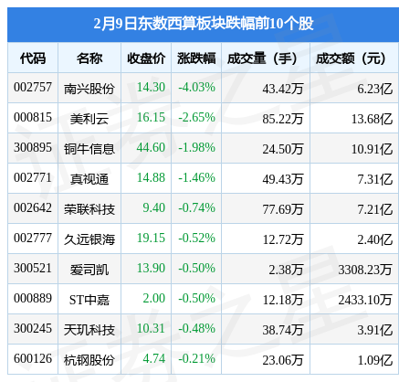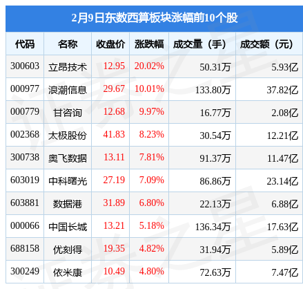 2月9日东数西算板块较上一交易日上涨3.1%,立昂技术(300603)领涨。当日上证指数报收于3270.38,上涨1.18%。深证成指报收于12048.27,上涨1.64%。东数西算板块个股涨跌见下表: