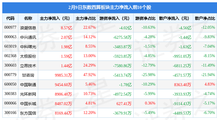 从资金流向上来看,当日东数西算板块主力资金净流入18.89亿元,游资资金净流出9.73亿元,散户资金净流出9.15亿元。东数西算板块个股资金流向见下表: