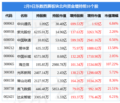 北向资金方面,当日东数西算板块北向资金持股市值为198.99亿元,增持2.02亿元。其中增持最多的是中兴通讯,增持了1.92亿元。减持持最多的是科华数据,减持了0.44亿元。东数西算板块北向资金持股变动明细见下表:
