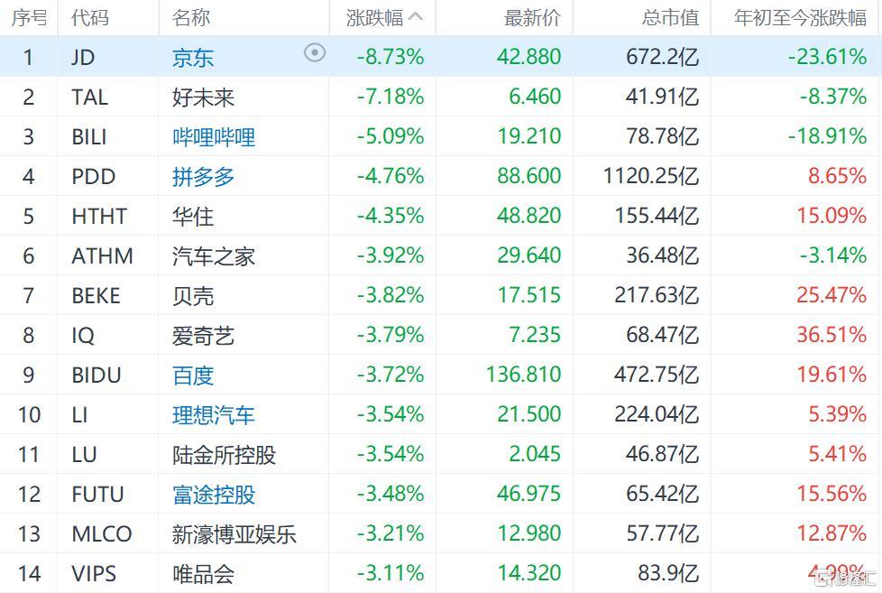 格隆汇3月9日丨纳斯达克中国金龙指数跌3.04%,京东跌8%,好未来跌7%,哔哩哔哩跌5%,拼多多、华住跌4%,汽车之家、爱奇艺、百度跌3%。